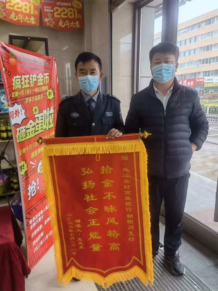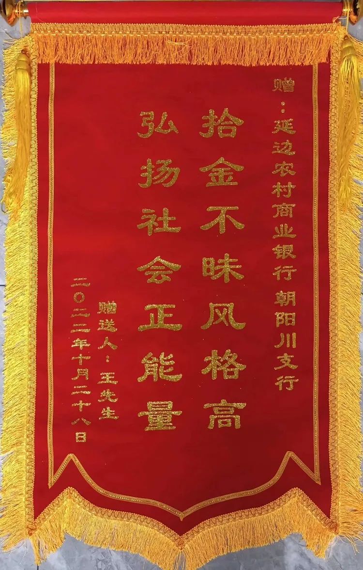 10月29日,延吉市民王先生來到延邊農(nóng)村商業(yè)銀行朝陽川支行,將一面寫有“拾金不昧風(fēng)格高,弘揚社會正能量”的錦旗送至銀行大廳,感謝小棉襖集團(tuán)派駐保安員劉兆德拾金不昧的精神。