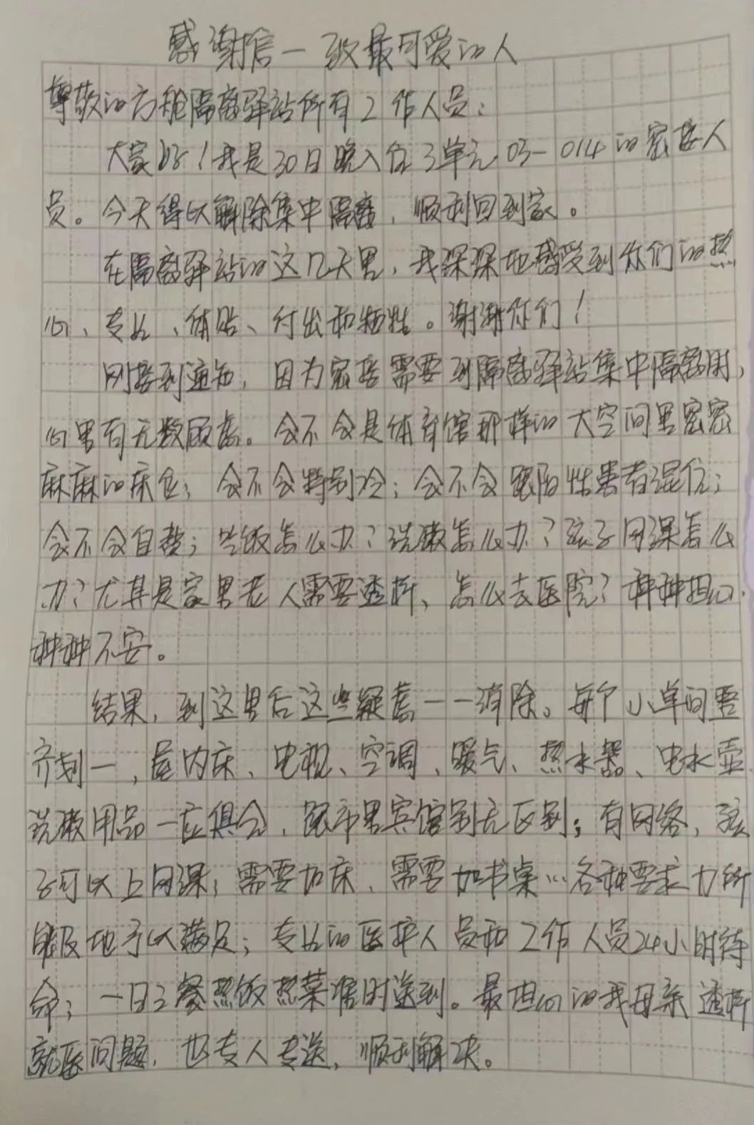 在隔離驛站的這幾天里,我深深地感受到你們的熱心、專(zhuān)業(yè)、體貼、付出和犧牲。謝謝你們!