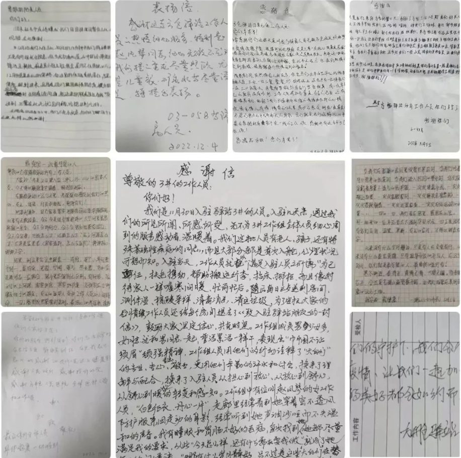 小棉襖集團(tuán)管理團(tuán)隊(duì)自11月27日入駐延吉市方艙驛站以來(lái),陸續(xù)收到了許多客人的表?yè)P(yáng)信,信中真摯的話(huà)語(yǔ)、熱烈的情感像冬日的暖陽(yáng)般充滿(mǎn)正能量,下面讓我們一起重溫表?yè)P(yáng)信中那些真摯的話(huà)語(yǔ)所帶來(lái)的溫暖吧!