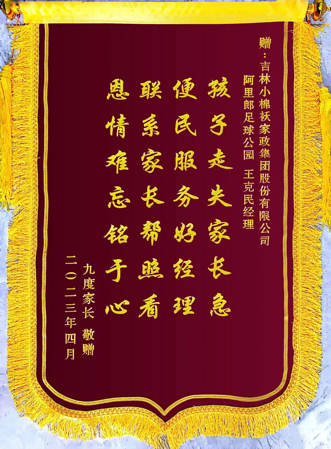 “太感謝你們了,你們就是孩子的守護(hù)神!”2023年4月14日一大早,延吉市市民龐先生便來到小棉襖集團(tuán),向小棉襖集團(tuán)派駐到阿里郎足球公園的經(jīng)理王克民贈送錦旗,表達(dá)自己的感激之情,錦旗內(nèi)容為:“孩子走失家長急,便民服務(wù)好經(jīng)理,聯(lián)系家長幫照看,恩情難忘銘于心”。