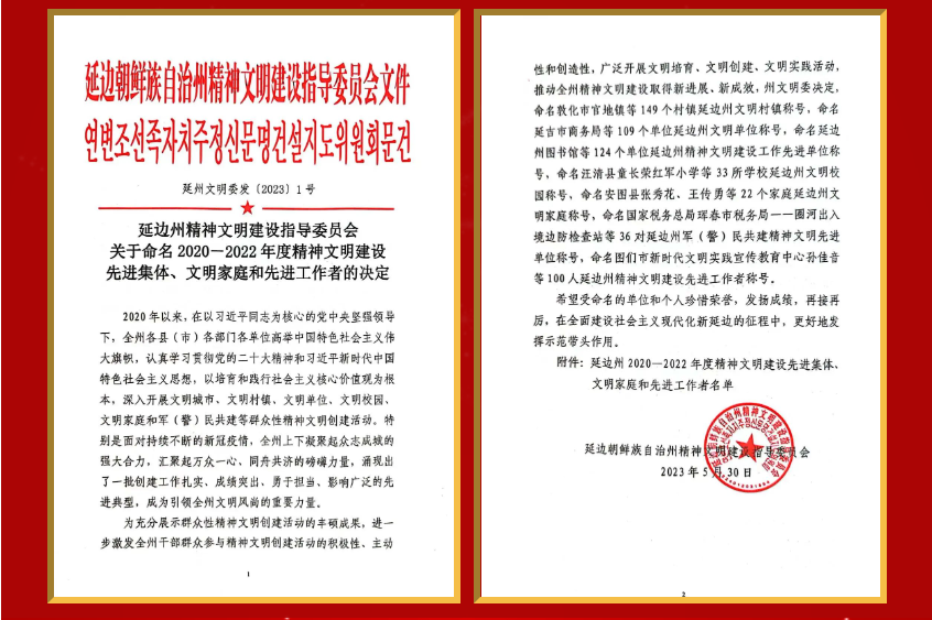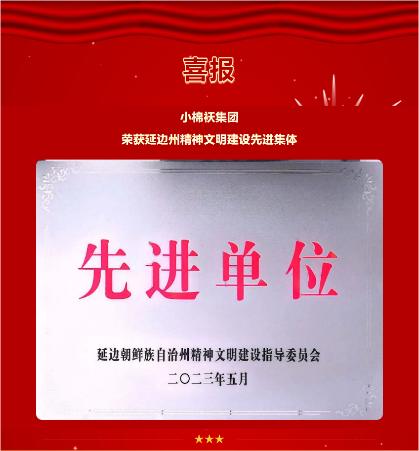 2023年6月,為充分展示群眾性精神文明創(chuàng)建活動(dòng)的豐碩成果,進(jìn)一步激發(fā)全州干部群眾參與精神文明創(chuàng)建活動(dòng)的積極性、主動(dòng)性和創(chuàng)造性,廣泛開(kāi)展文明培育、文明創(chuàng)建、文明實(shí)踐活動(dòng),推動(dòng)全州精神文明建設(shè)取得新進(jìn)展、新成效,延邊州文明委決定,命名小棉襖集團(tuán)為延邊州2020-2022年度精神文明建設(shè)先進(jìn)集體稱(chēng)號(hào)。