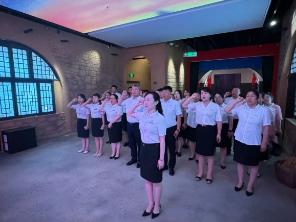 走進(jìn)一樓大廳,在由金達(dá)萊花、抗聯(lián)戰(zhàn)士群像、邊防戰(zhàn)士和各族人民幸福生活等元素構(gòu)成的《紅太陽照邊疆》巨幅油畫,小棉襖集團(tuán)黨員干部面對(duì)鮮紅的黨旗,莊嚴(yán)地舉起右手握拳宣誓,重溫入黨誓詞,一字一句,莊重而神圣,體現(xiàn)了感黨恩、跟黨走的信念,飽含著大家對(duì)黨的忠誠和熱愛之情。